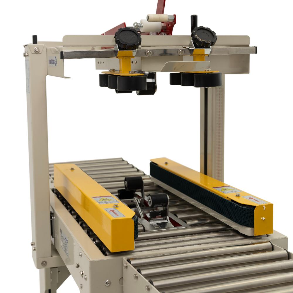 это профессиональное оборудование для быстрой и аккуратной заклейки верхних и нижних стыков картонных коробов клейкой лентой (скотчем). Модель предназначена для малых и средних предприятий в сфере пищевого производства, упаковки и фасовки, складской логистики и интернет-торговли. Заклейщик оснащён боковыми конвейерными ремнями для автоматической протяжки короба, что обеспечивает непрерывный процесс упаковки без необходимости постоянного присутствия оператора.
