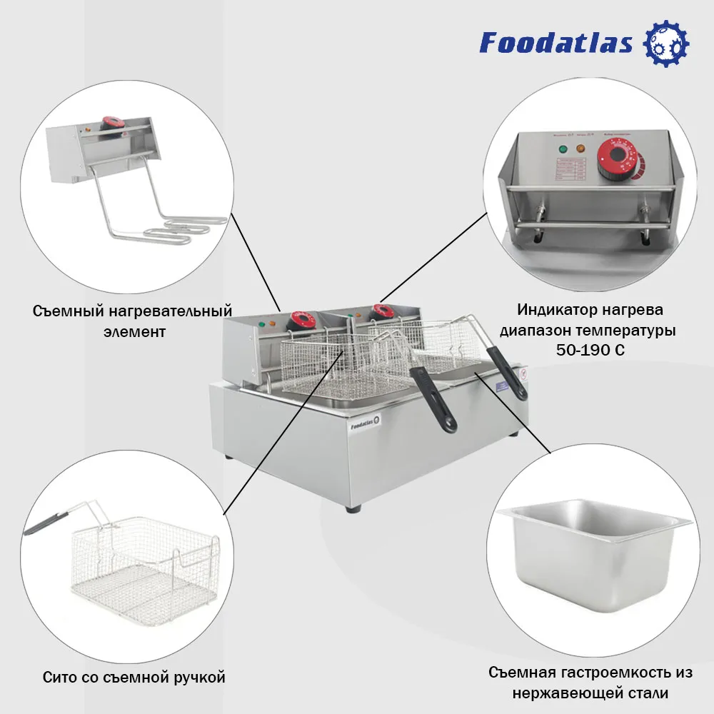 Фритюрница (6л +6л) DF-82 Foodatlas Eco — отличное и качественное оборудование, с помощью которого продукты обжариваются до нежной и румяной корочки. В комплекте идут прочные корзины, модель имеет механическое управление.