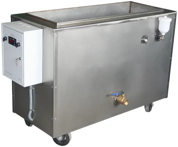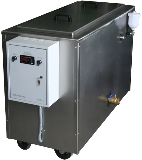 Устройство оборудования характеризуется качественным исполнением трехслойной емкости из нержавеющей стали АІSI 321. Габариты аппарата в мм - 1 100 х 400 х 900. Объем рубашки для наполнения теплоносителем достаточно внушительный – 70 л, а самим наполнителем выступает масло ПМС-100. Оно обеспечивает замачивание форм при максимальной рабочей температуре в 90 град С. Для процесса нагрева установлена ТЭНная коробка, в которой находиться один из регуляторов температуры. Второй помещен в самой емкости с моющими средствами для форм. Все комплектующие отобраны из каталогов лучших европейских производителей. Время, необходимое для чистки алюминиевых форм, варьируется зависимо от меры и вещества загрязнения, но на данном оборудовании чистка форм для печенья все равно сведена к возможному минимуму.